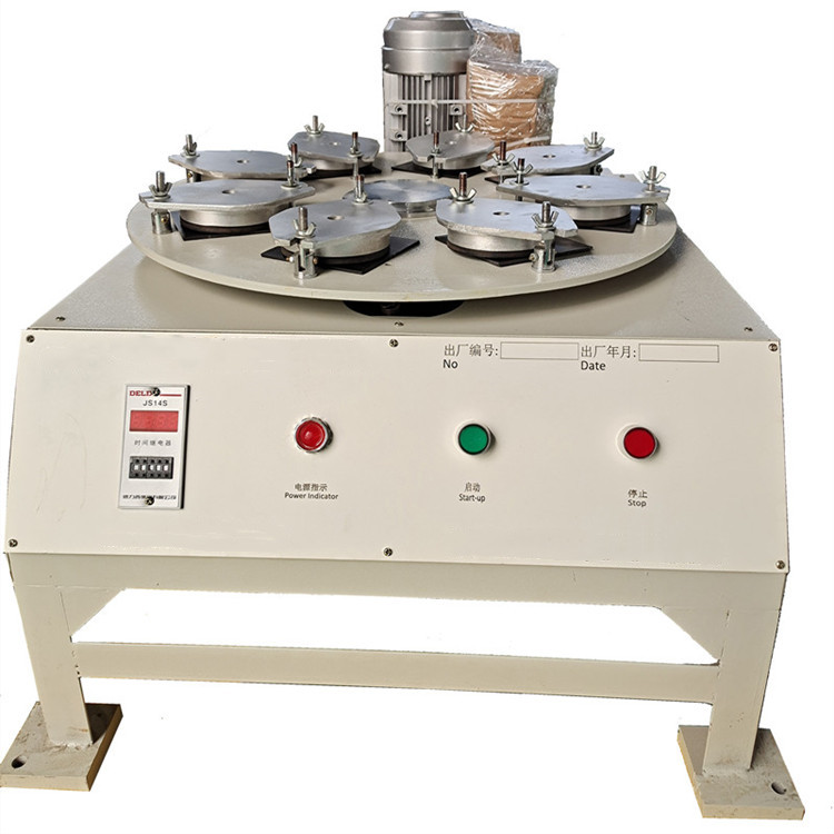 該儀器由機體、傳動機構、支承轉盤、八個帶橡膠密封的金屬夾具盒和電控裝置組成。電機通過傳動機構,支承盤以每分鐘300轉速運轉,隨之產生22.5mm的偏心距(e),因此,使每塊試樣做直徑為45mm的圓周運動,從而使磨料在試樣釉面上研磨,電控裝置將預先設定的轉數進行控制,當達到預定轉數時,可自動停機。該設備具有結構新穎、運轉平穩、噪音低、操作簡便,可同時作8個和少于8個樣品的試驗,由于配置有數顯時間繼電器,操作者只需接通電源,不需任何監視,它將按照所設定 的時間(轉數)自動完成。